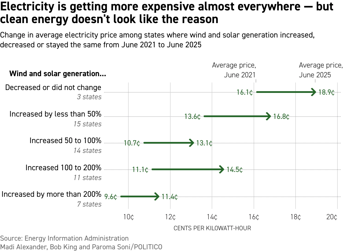 Politico’s analysis, based on U.S. Energy Information Administration (EIA) power price data, found that in June of this year, 17 of the 22 states with above-average renewable energy production also had below-average electricity prices, a clear challenge to claims that clean energy drives up costs.
